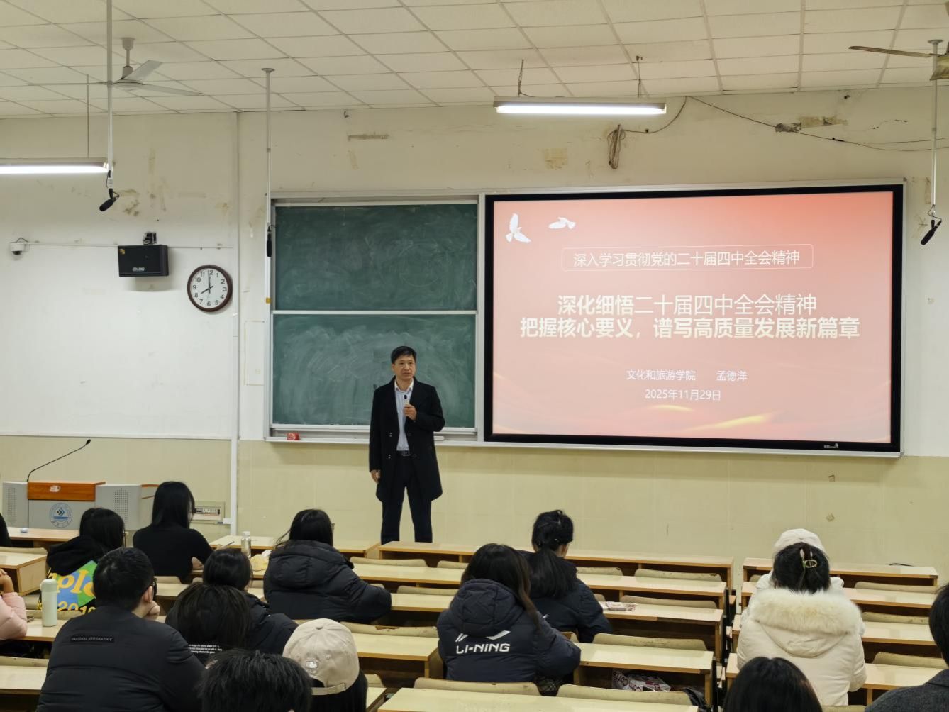 2025年11月29日,文化和旅游学院党委书记孟德洋在学院多媒体教室开展了党的二十届四中全会精神宣讲活动,以《深化细悟党的二十届四中全会精神,把握核心要义,谱写高质量发展新篇章》为题做宣讲报告。