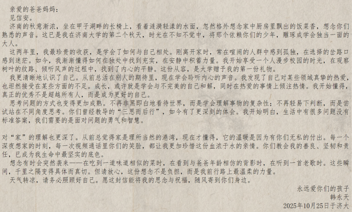 为弘扬尊老敬老的中华优秀传统美德,引导学生关注家庭情感与代际沟通,济南大学文化和旅游学院心理服务协会于2025年10月24日至10月31日面向全院学生成功开展了“九九话重阳,青春绘新意”重阳专属语线上征集活动。活动以重阳节文化内涵为核心,鼓励学生通过现代诗文、家书、创意表情包等形式,向长辈表达感恩之情,传递青春视角下的传统文化新意,受到同学们的广泛关注和积极参与。