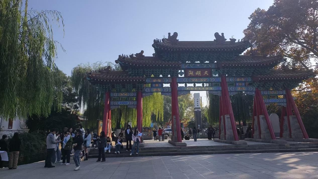 随后,研学队伍抵达大明湖,开启历史人文探寻之旅。此前,师生已共读刘鹗《老残游记》中对大明湖“四面荷花三面柳”等的经典描写。当同学们站在历下亭前,看到亭内杜甫“海右此亭古,济南名士多”的石刻时,书中的“文人雅趣”便在眼中铺成了活生生的画面。研学过程中,大家沿着湖岸行走,对比超然楼里的老照片与今日湖景,讨论着“大明湖如何承载济南的不变之根”;在拍摄历下亭与湖面同框的画面时,更忍不住畅想“若老残穿越而来,会如何描述今人拍湖景的场景”。一瞬间,历史文本与当下体验产生了有趣的碰撞。