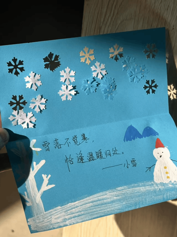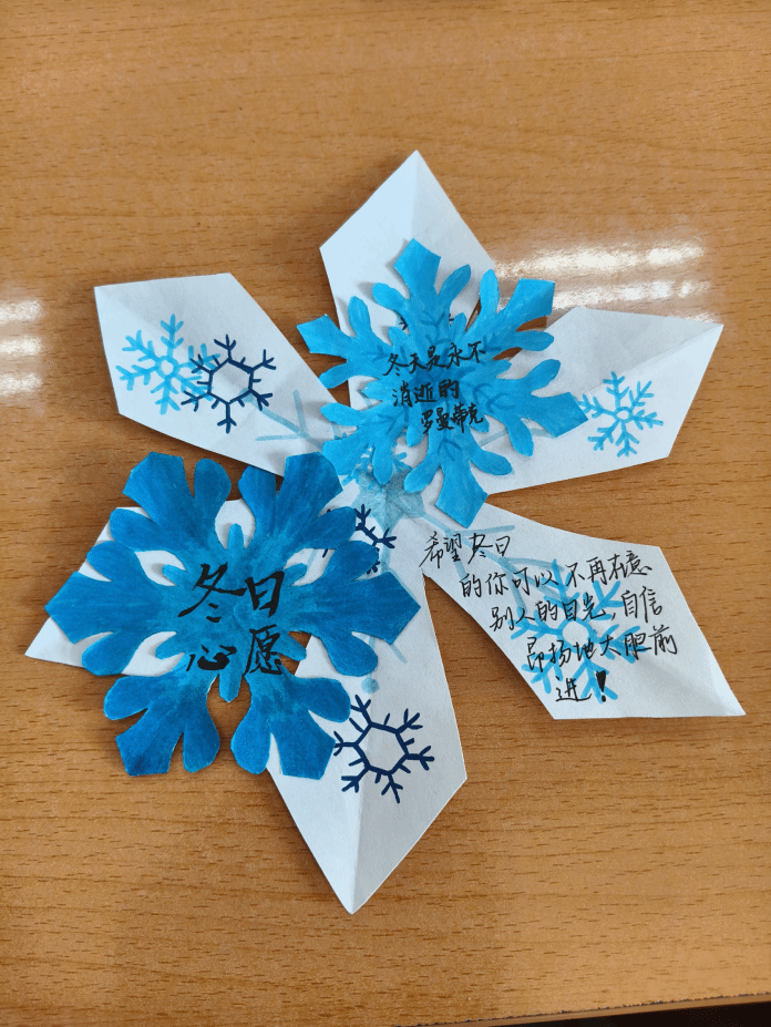 小雪时节,万物潜藏,人心亦需静养。本次活动紧密结合文化与旅游学院的学科特色,将节气文化与心理健康教育相融合,设有两种创意表达形式:一是“静养‘进’补,暖心手写信”,鼓励学生写信给冬季的自己,以文字为心灵注入温暖,寄托对未来的期待;二是“心愿雪花,静待春召”,引导学生裁剪雪花卡片并书写心愿或感悟,以象征的方式表达对未来的美好期许。同学们通过纸笔传递情感,既舒缓了季节转换带来的情绪沉淀,也在创作中强化了自我对话与内在关怀。