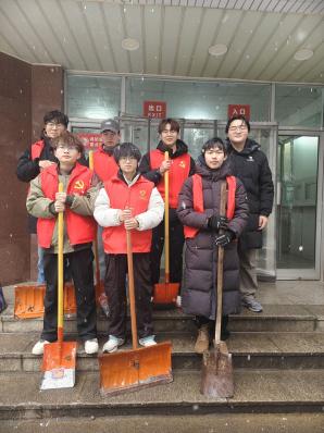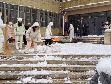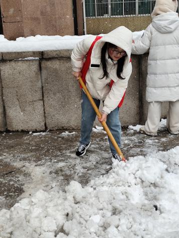2025 级的新生们带着学院下发的扫帚、铁锹、雪推板,按照预先分配的区域迅速投入 “战斗”:教学楼入口处,他们弯腰弓背,用扫帚细细清扫台阶缝隙的薄冰,生怕过往师生脚下打滑;主干道上,有人奋力挥动铁锹铲破冰层,“咚咚” 的声响成了冬日里的奋进节拍;有人推着雪推板将积雪整齐堆到绿化带旁,还有人合力搬运厚重的雪堆 —— 分工明确、配合默契,动作虽略显生疏,却透着一股不服输的韧劲。