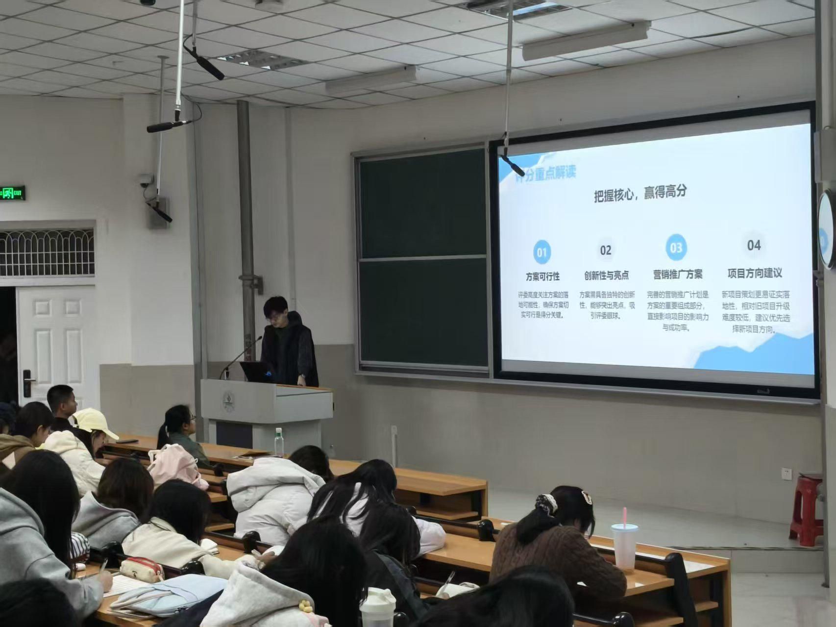 备赛技巧方面,胡展豪同学给出了诸多实用建议。他强调了团队分工的重要性,并分享了路演材料准备的要点和评分标准解读。这些建议帮助同学们明确了项目核心,凸显了方案的创新性与亮点,为打造高质量的营销方案提供了有力支持。此外,胡展豪同学还通过展示国奖获奖作品,展示了如何将前沿科技与地方文化、产业相结合,创造出具有创新性和可行性的项目方案。
