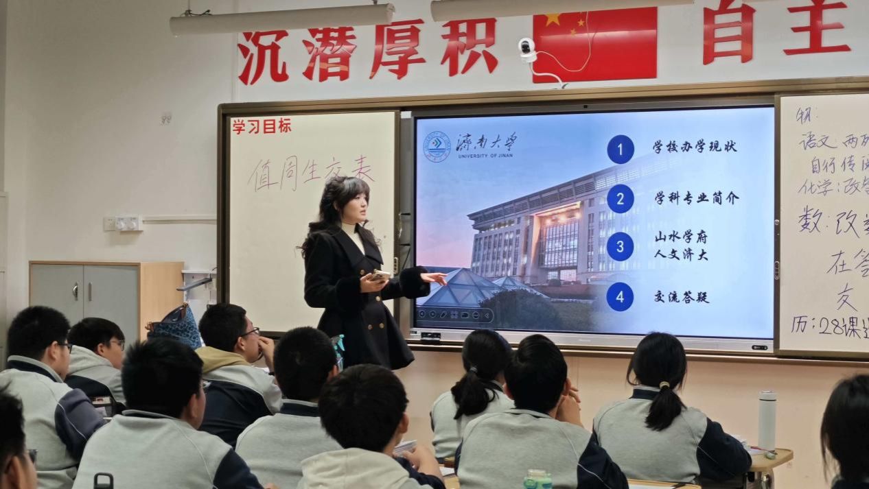 侯姝君同学重返高中母校,开展济南大学招生宣传与学习经验分享活动。她向学弟学妹详细介绍了济南大学的校园环境、教师阵容、学科优势以及招生政策。随后,她结合自身高中学习心得与备考经验,分享实用的学习方法与应试技巧。宣讲中她耐心解答同学们的疑问,鼓励大家坚定目标、脚踏实地、全力备战高考。她表示参加此次实践活动不仅加深了她与母校的情谊,更让她在交流分享中锻炼了综合能力,增强了作为济大学子的荣誉感与责任感。
